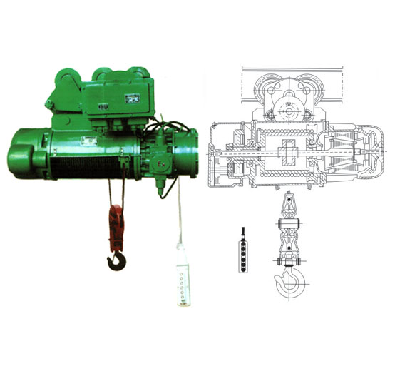 BCD型防爆鋼絲繩電動葫蘆主體可懸掛在工字梁軌道上作直線或曲線運行,或安裝在固定支架上,作為起吊重物之用??梢愿鶕?jù)不同使用要求,同防爆單梁懸掛起重機或雙梁橋式起重機配套使用。