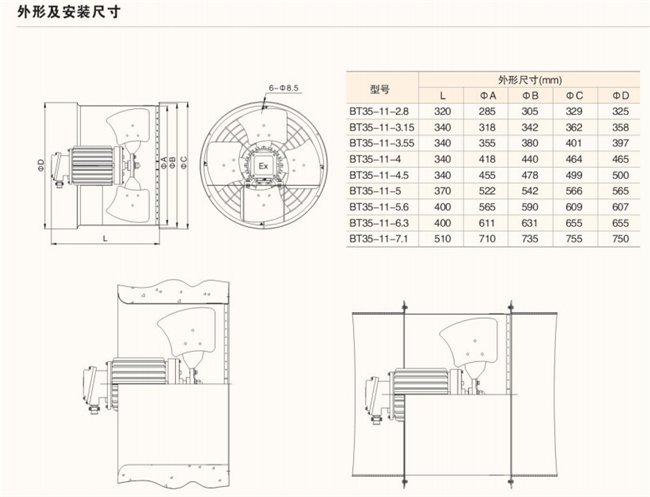 ● 壁式:風(fēng)扇外形兩端一邊是喇叭口型,一邊是90°直角法蘭型;